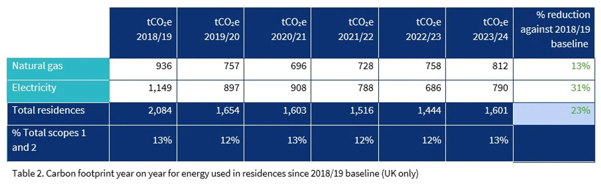 Queen Mary operates several halls of residence that offer accommodation on campus or a short distance away. Carbon emissions from residences account for around 12% to 15% of our total scopes 1 and 2 emissions (see table 2).