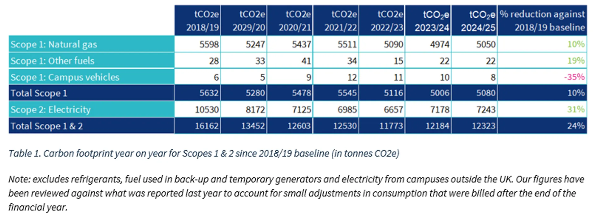In 2024/25, Queen Mary achieved a 24 per cent carbon reduction against the 2018/19 baseline for scope 1 and 2 emissions, despite growth of the estate since the baseline. Besides a 31 per cent reduction in scope 2 emissions (indirect emissions from electricity production) there has been a further 10 per cent reduction in scope 1 emissions (emissions related to energy and fuel use in our directly managed buildings and campus vehicles) by 2024/25 against the 2018/19 baseline as shown in Table 1. The significant scope 2 reduction has been possible due to both investment into energy reduction projects that have been focused on our top ten energy consuming buildings and the decarbonisation of the grid. Compared to last year, we saw a slight increase of 1% in scope 1 and 2 emissions due to a small increase in energy consumption, with reductions achieved through BMS optimisations and upgrades being offset by energy increases caused by technical faults and a new data centre.