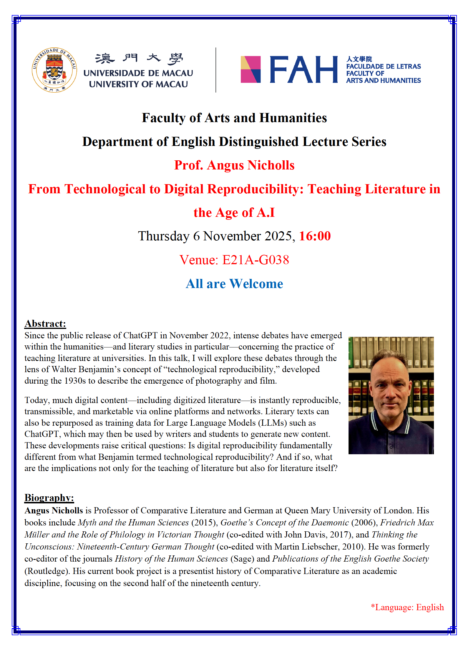 Professor Angus Nicholls delivered a talk at the University of Macau on 6 November 2025. His lecture, titled From Technological to Digital Reproducibility: Teaching Literature in the Age of A.I., was part of the Department of English Distinguished Lecture Series.