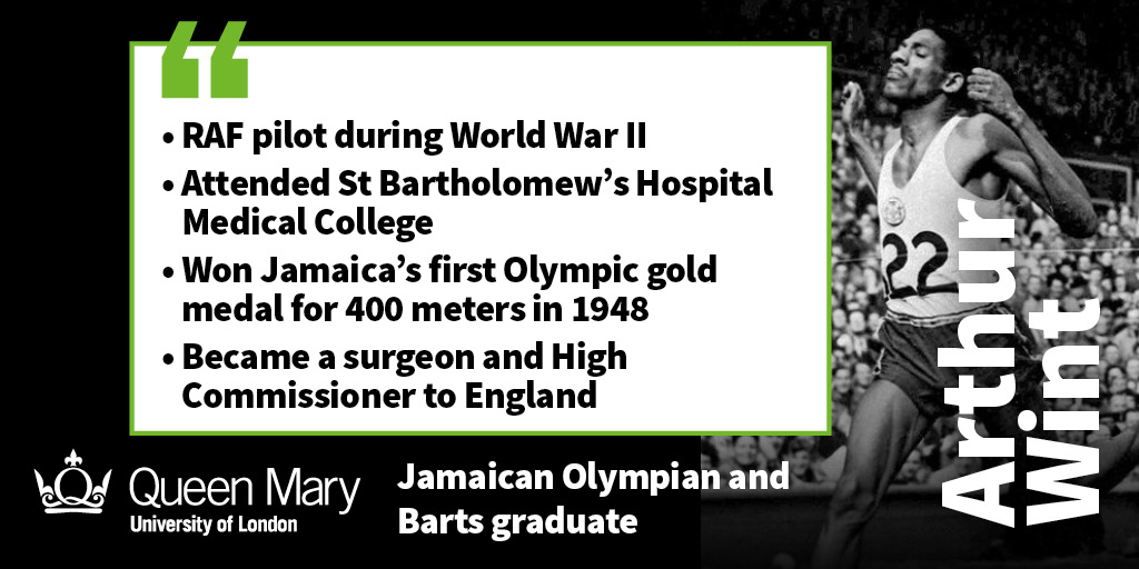 Arthur Wint MBE, known as the Gentle Giant, was born in Jamaica in 1920. He was sent to Britain for active combat during World War II as a pilot, leaving the Royal Air Force in 1947 to attend St Bartholomew's Hospital as a medical student through a Colonial Development and Welfare scholarship.