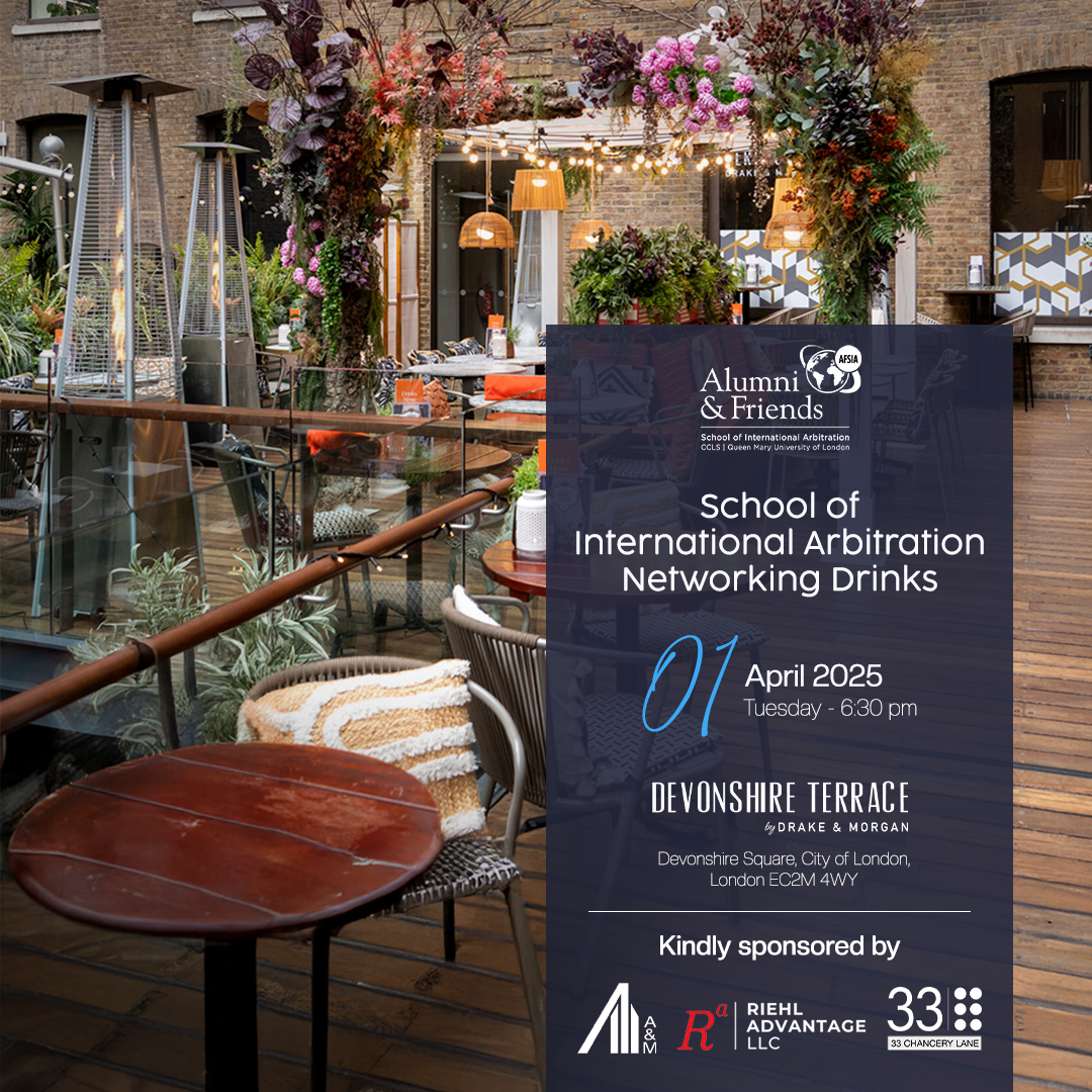 AFSIA’s 4th School of International Arbitration Networking Drinks will take place on 1 April 2025, at 6:30PM at Devonshire Terrace, Devonshire Square, City of London, London EC2M 4WY.