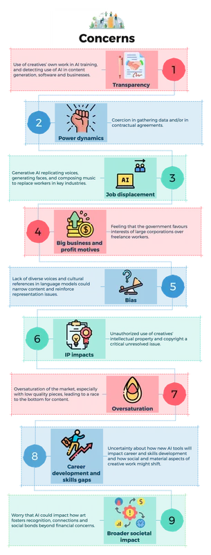 Generative AI introduces significant concerns for creative professionals, including job displacement, power imbalances, and the devaluation of human creativity. Freelancers, in particular, face intensified vulnerabilities due to exploitative contracts, lack of transparency, and diminished opportunities as AI tools replicate creative outputs. Additionally, issues like bias, oversaturation of markets with low-quality AI-generated content, and broader social implications exacerbate the challenges already present in the industry.