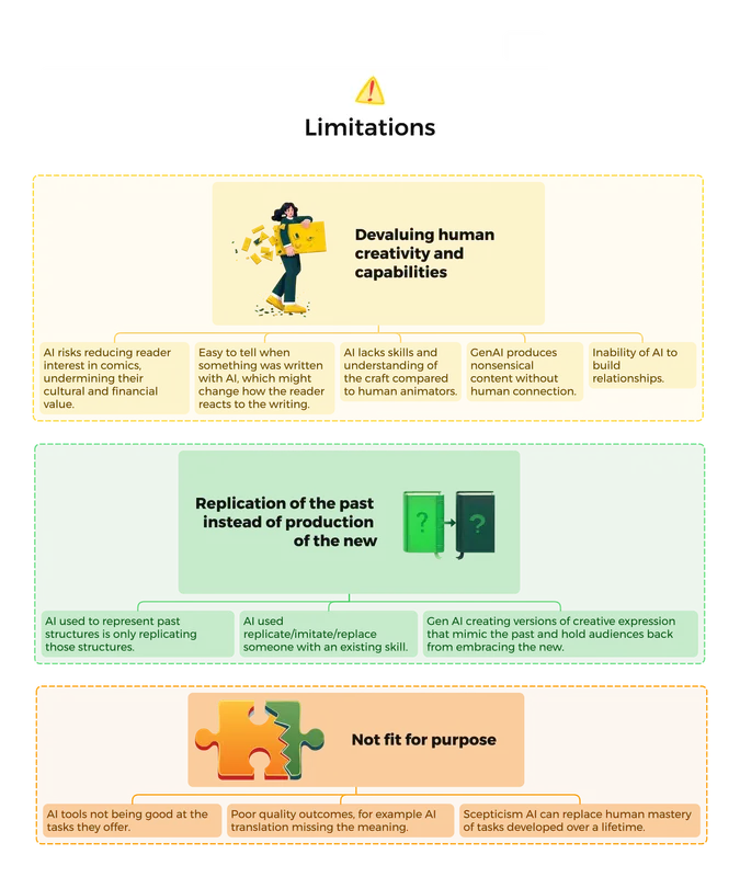 Despite its benefits, generative AI has clear limitations, including the replication of past patterns rather than fostering innovation and inadequacies in handling complex or nuanced tasks. Many participants emphasized that AI cannot replicate the relational aspects of creative work or match the expertise gained through decades of practice. Furthermore, bias within AI systems and the lack of cultural diversity in training data raise questions about the suitability of these tools for the creative sector.