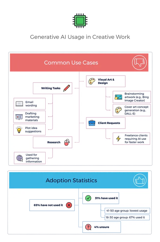 Across both waves of the survey sent to creative workers, common use cases for Generative AI included writing, research and visual design. AI is also used to speed up response time to clients. Only 31% of respondents had used any form of AI in their work. Of those, adoption rates where highest among younger workers and lowest in the 41-50 age bracket.