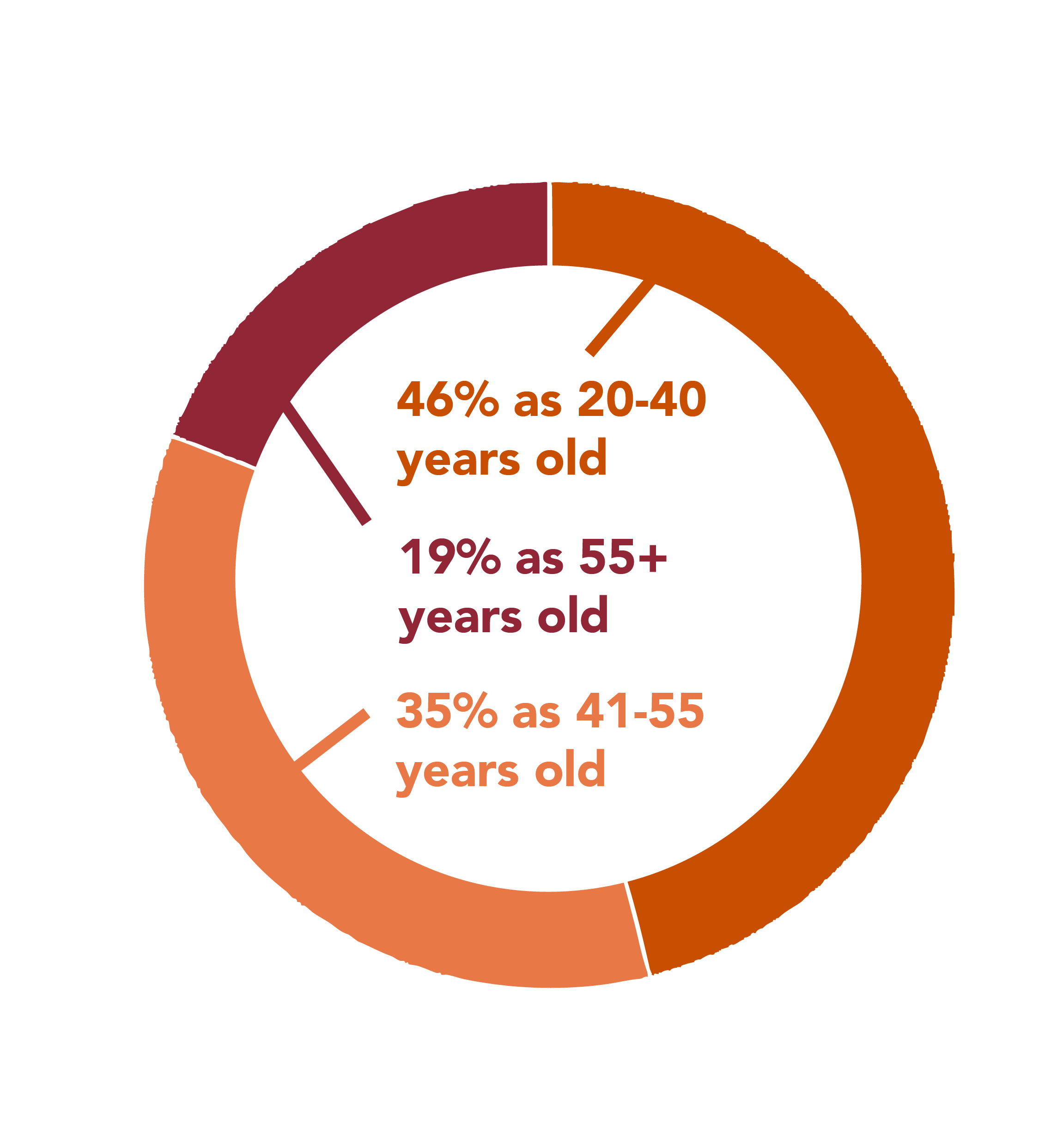 - 46% reported their age as 26-40, 35% as 41-55 and 19% as 55+