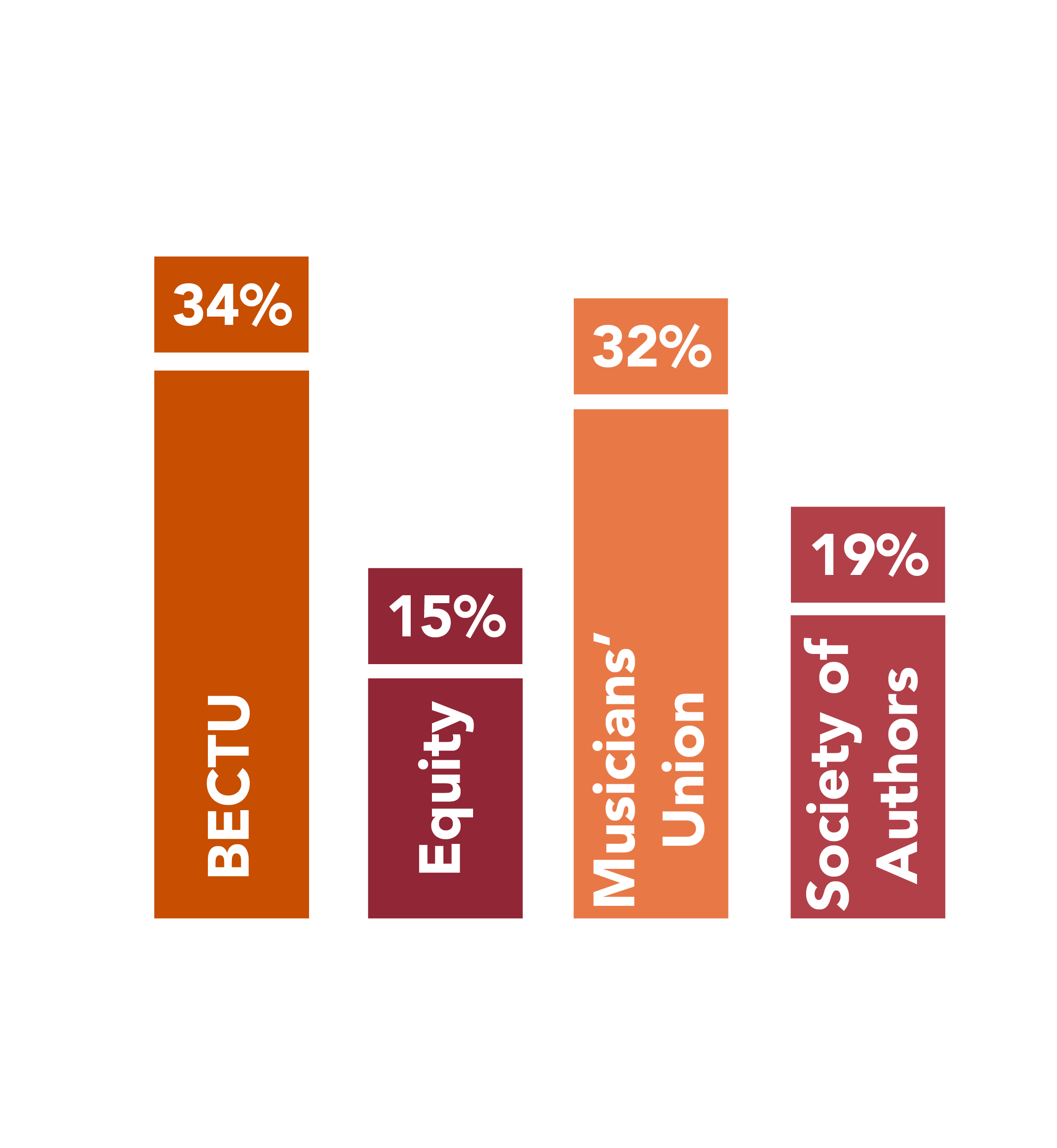 - 34% were members BECTU, 15% Equity, 32% Musicians’ Union and 19% Society of Authors