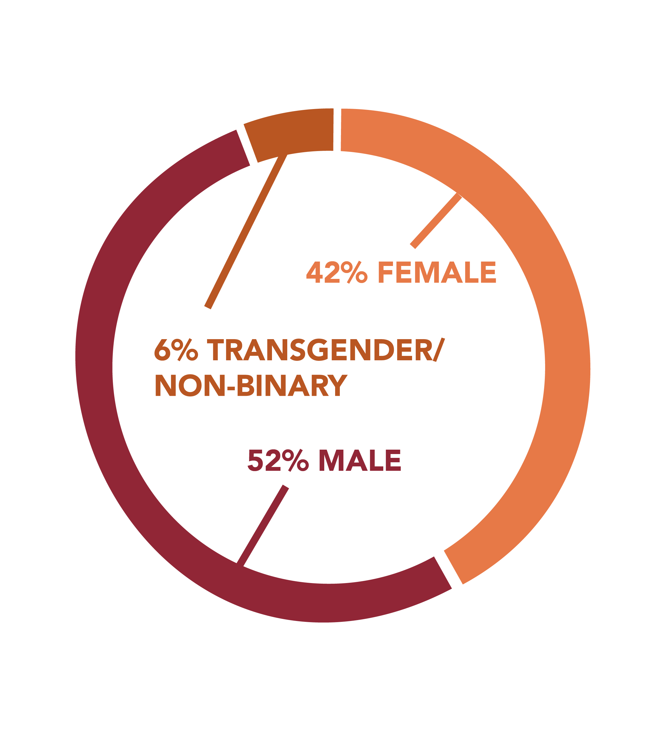 - 42% of participants reported their gender as female, 52% as male and 6% as transgender or non-binary