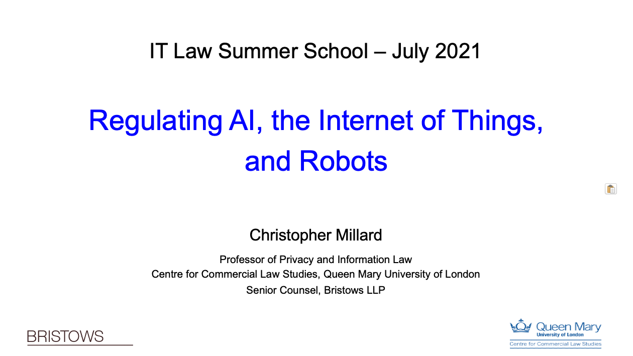 Christopher Millard co-chaired IT Law Summer School 2021 at Downing College, Cambridge and gave lectures on ‘Cloud Computing’, ‘GDPR’s Territorial Scope and the Roles of Controllers and Processors’, and ‘Regulating AI, the Internet of Things, and Robots’