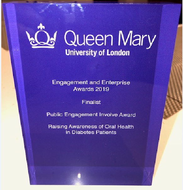 A team of IoD staff led by Dr Aylin Baysan was the finalist for the Involve Award in the Public Engagement categories for the Engagement and Enterprise Awards 2019 for their project entitled “Raising awareness of Oral Health in Diabetes patients”.