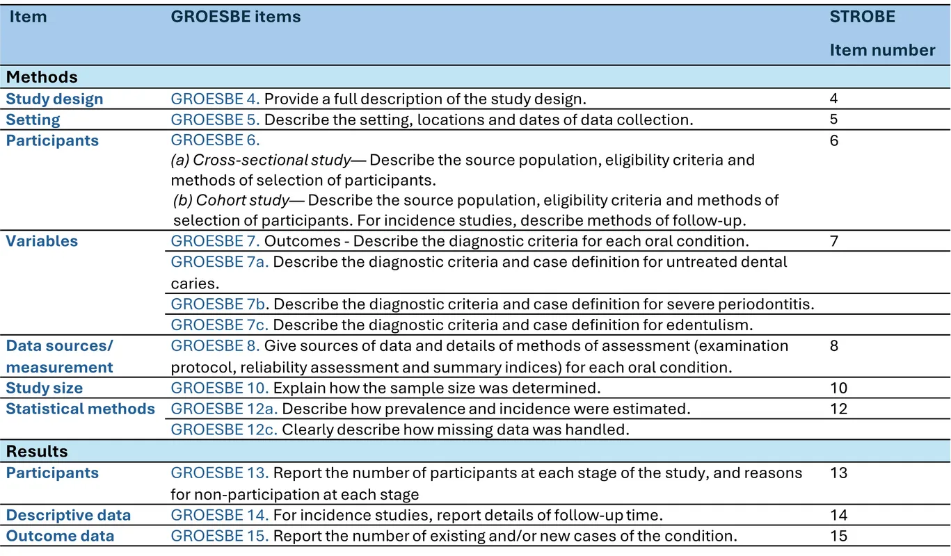 GROESBE was developed as an extension to the STROBE statement and follows the same structure (Table). The GROESBE checklist provides additional details for 10 of the 22 items on the STROBE checklist. When no specific GROESBE item is listed in the Table, this means that the original STROBE item alone suffices.