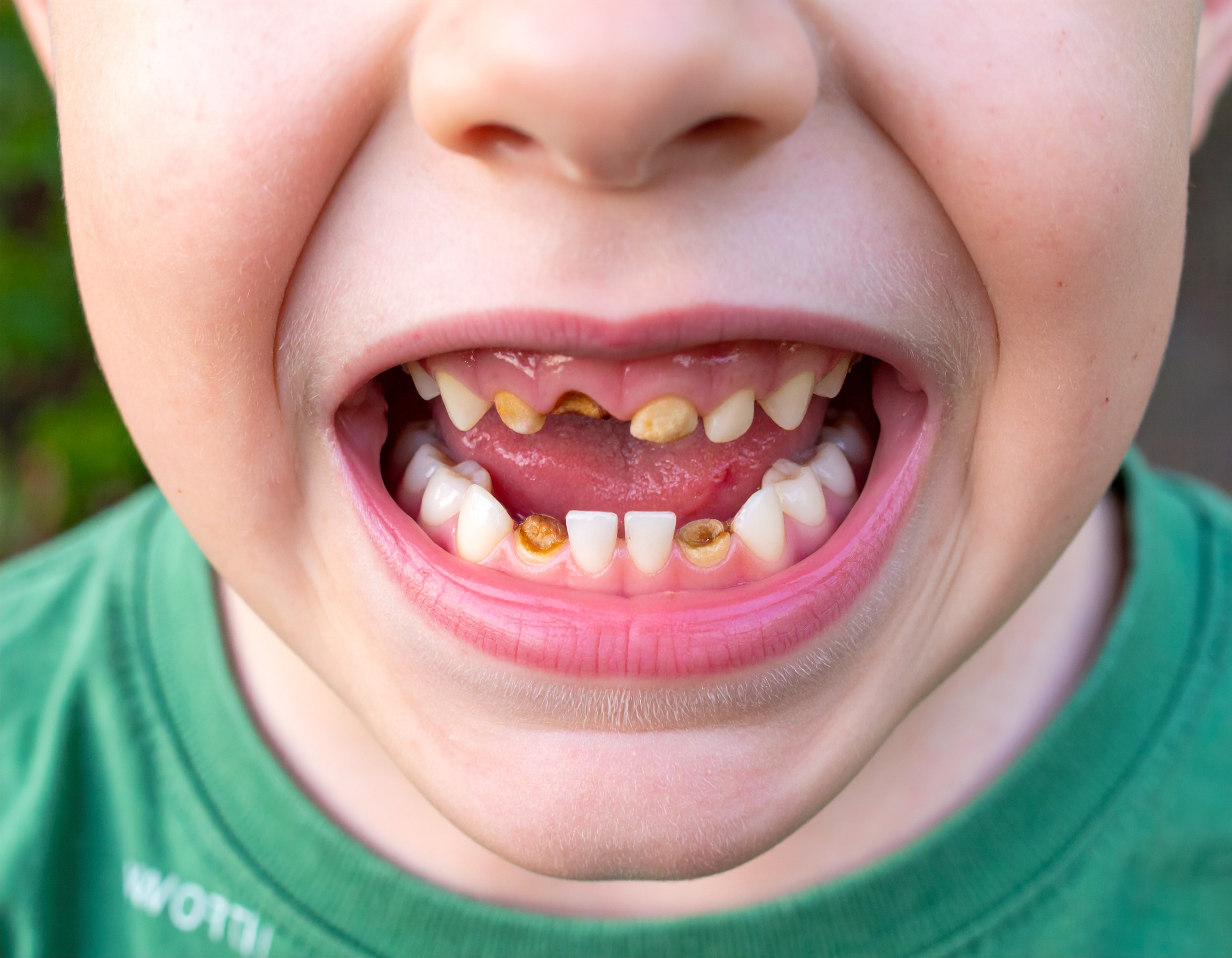 The picture above shows a child with tooth decay in primary teeth (the first set of teeth). Image generated using AI.