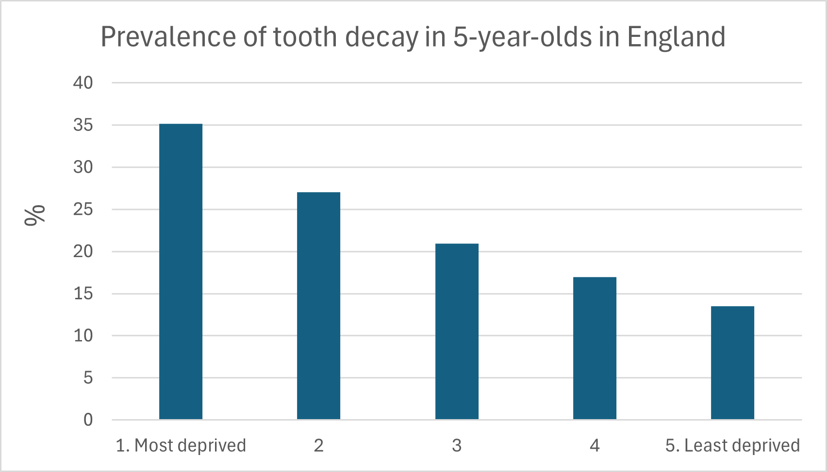 The graph below shows the increase in the proportion of 5-year-old children with tooth decay across different levels of area deprivation.