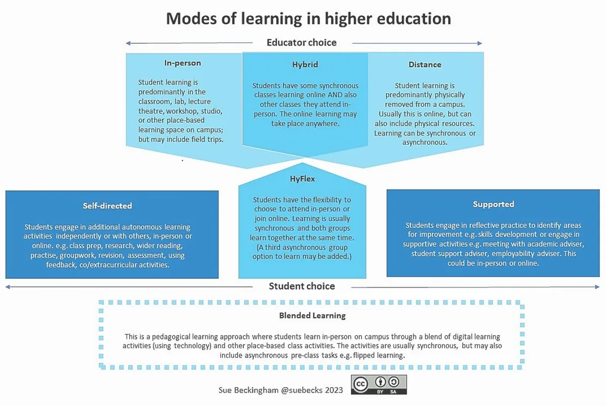 One of the most notable aspects of Sue Beckingham’s model above is that it emphasises the aspect of choice (Beckingham et al., 2022), more so than the axes of location (online and campus) and time (synchronous and asynchronous) that traditionally inform definitions of blended learning.