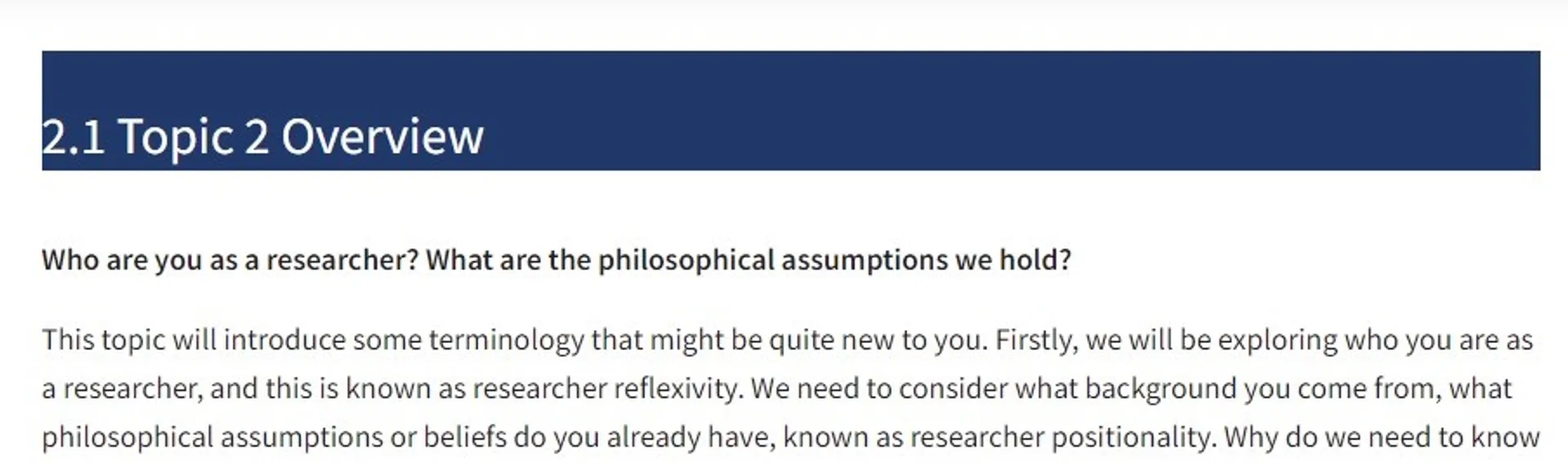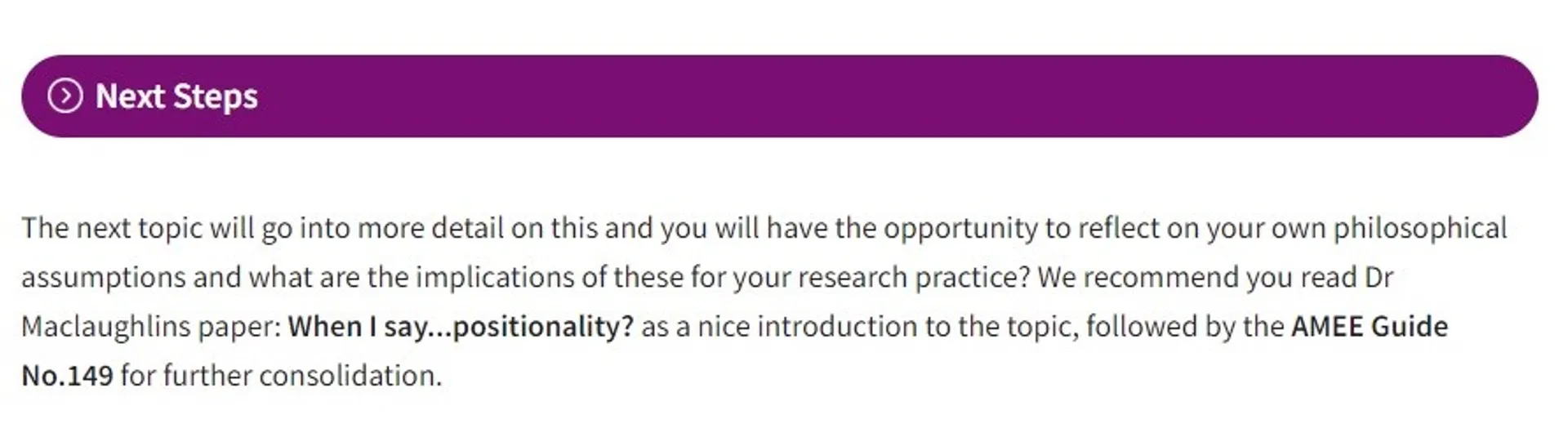 The Next steps Heading helps signpost the learner to the next topic and how they might prepare for it. This gives a visual consistency to the end of each topic whilst providing a call to action for further resources. It works best when it is made clear how the resources relate to the next topic, or if you have information on one page and an activity on the next, the next steps banner highlights how they will be using the current page later in the week or on the next page.