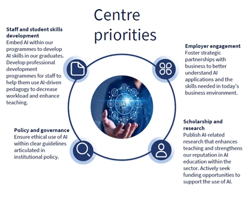 The Digital Education Studio interviewed Dr. Xue Zhou, Head of the Center, and Dr. Aisha Abuelmaatti, Deputy Head, to discuss the center's current work and future plans. They explained that four key priorities underpin the Centre’s collaborations with students, academics, and industry partners: staff and student skill development; AI policy and governance; employer engagement; and AI scholarship and research. Below we explore each of these priorities, and the associated collaborative work.
