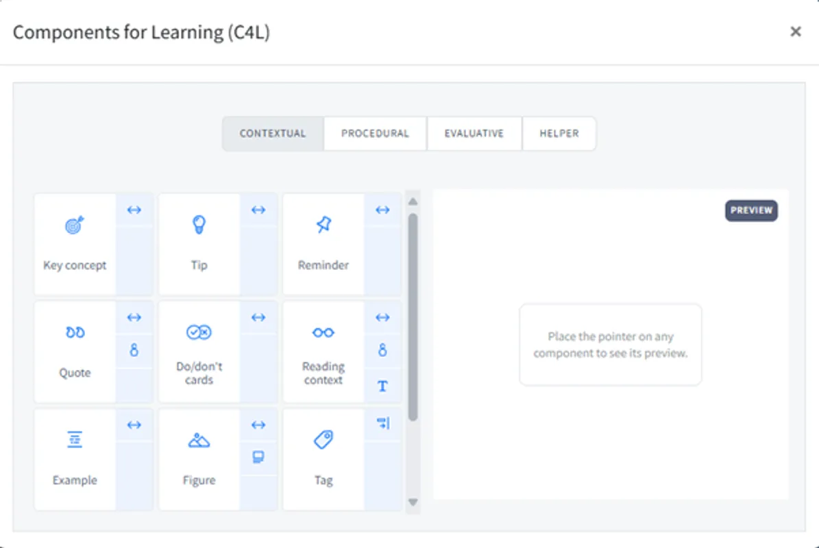 Explore the menu of components, split across four categories: Contextual, Procedural, Evaluative and Helper: