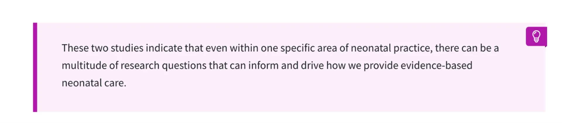 This Tip component is designed to highlight an insight or idea that helps guide students in their learning. In this case, it encourages learners to see how even a focused area of neonatal practice can generate multiple research questions, prompting them to think critically about evidence-based care.