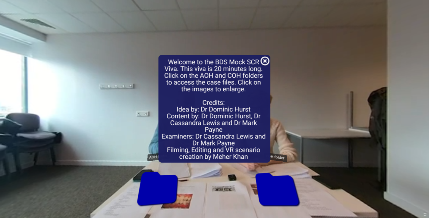 Dr Dominic Hurst, Senior Lecturer of Institute of Dentistry, collaborated with Meher Khan, Electronic Resources Officer, Institute of Dentistry and the Dentistry e-learning team to create a virtual reality mock structured clinical reasoning (SCR) exam for dental students. The aim was to help students prepare for their exams by giving them a simulating exam environment, in a timed condition.