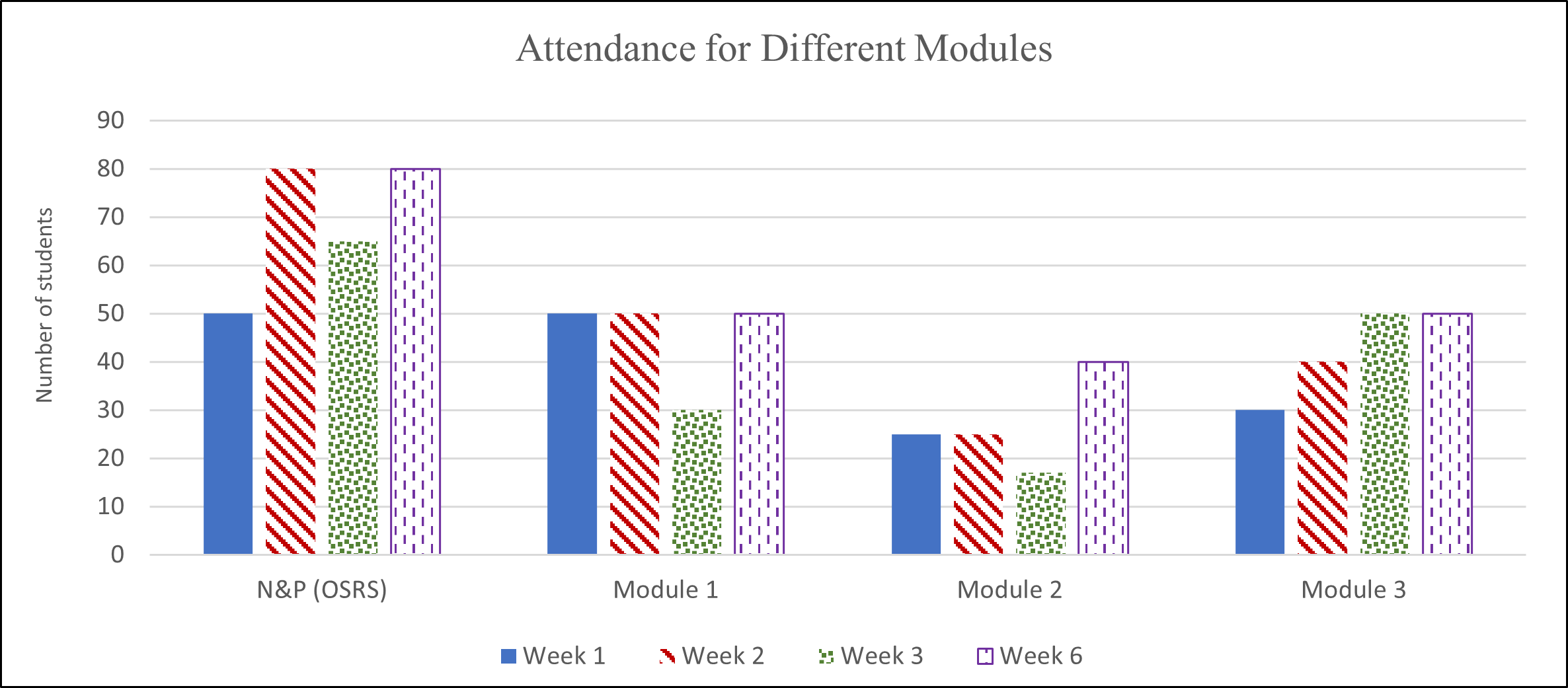 The graph illustrates that after the announcement of the activity in the first week, students’ attendance at the live lecture increased significantly during Covid. Whereas the attendance of other modules from the same year of study and from the same programme kept going low.