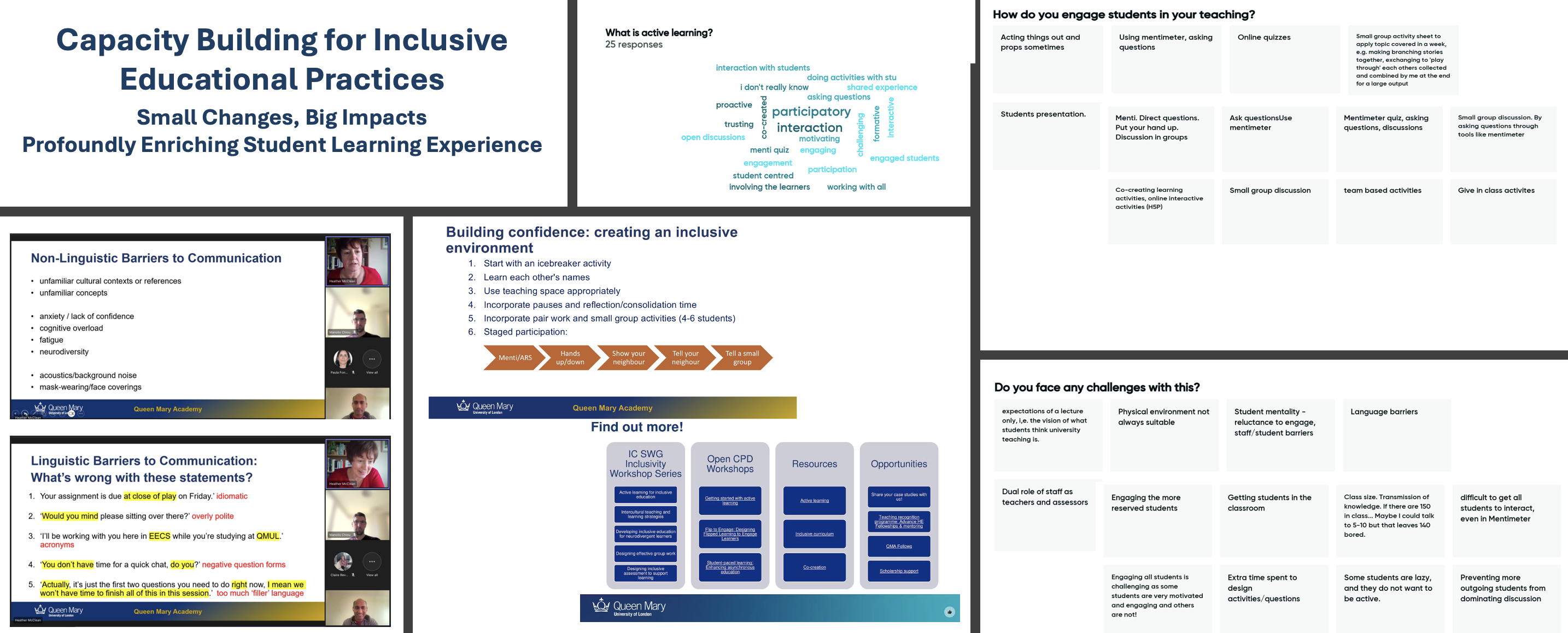 These bespoke workshops are designed based on the identified needs of both EECS and its Transnational Education (TNE) programmes. This is a part of the activity towards IC SWG’s focused area “Awareness and Outreach for Capacity Building on Inclusivity among Colleagues”. The workshops, covering the QMUL's Principle of Inclusive Practices, are designed to not only raise awareness about inclusive practices but also help colleagues as guiding efforts in developing a more inclusive curriculum and teaching & learning environment as well as promote good practices.