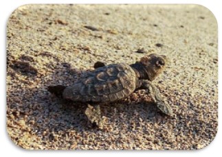 A recently released loggerhead sea turtle hatchling, heading toward the ocean.
