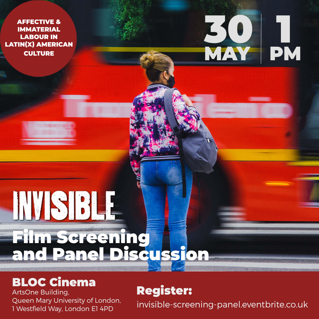 This event is being organised as part of the AHRC-funded project 'Affective and Immaterial Labour in Latin(x) American Culture'. For more information, see the blog site, which includes a co-authored blog post about the making of 'Invisible' and about the Invisible Commutes project.
