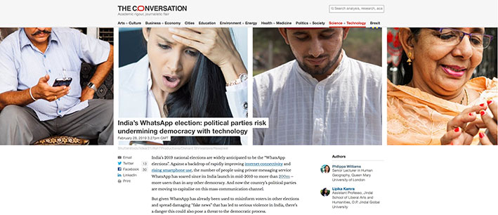 - India’s WhatsApp election: political parties risk undermining democracy with technology, The Conversation 28 February 2019 (reprinted by Scroll, Quartz, ChannelNewsAsia, Dawn, downtoearth.org.in, newscentral24x7)