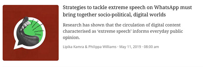 - Strategies to tackle extreme speech on WhatsApp must bring together socio-political, digital worlds, Scroll 11 May 2019