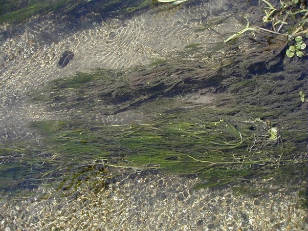 Excessive fine sediment deposits within a macrophyte stand over a gravel bed affecting river health (photo: L. Baldock)