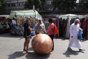 Globe is a copper sphere, 1 metre in diameter with four portholes holding cameras recording journeys and conversations with the public. Globe started life free of any imperfections but as it rolled through the streets, it’s copper exterior degraded and scarred, taking on the impressions of each route travelled, mapping each journey. Globe’s spatial politics are shaped by its spherical design, a mobile, dynamic and evolving piece of art.