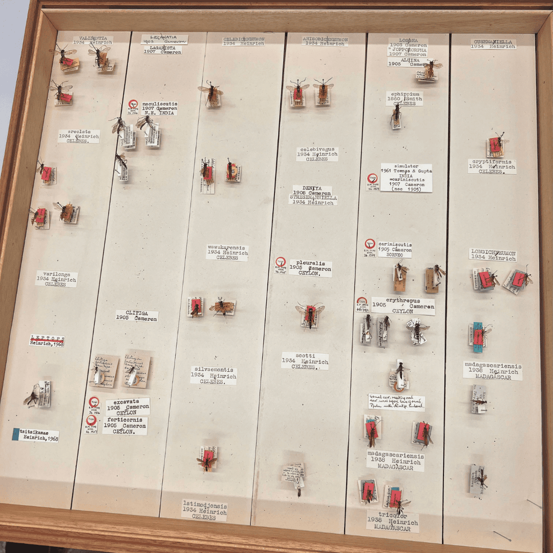 I carefully pinned them and brought the box to Dr Gavin Broad, the museum’s parasitic wasp expert. One specimen intrigued him greatly—a wasp striped in ivory and burnt orange, unlike anything he’d seen. He vanished into the collection and returned with an old box labelled Losgna, a genus nobody had touched since the 1960s. Inside lay a near-identical specimen tagged Losgna quintaxa. But here’s the catch: quintaxa had never been formally described. It was a scientific ghost—a name without a proper identity.