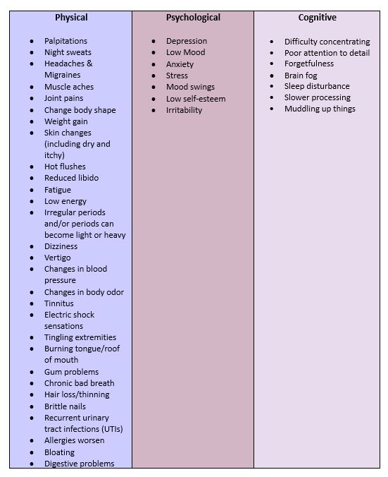 Perimenopause and menopause associated impacts can have a big impact on your daily life, including relationships, social life, family life and work. Associated impacts can feel different for everyone. You may have several of the associated impacts or none. Associated impacts usually start months or years before the menstrual cycle stops. Associated impacts can be physical, psychological and cognitive. Please see examples below: