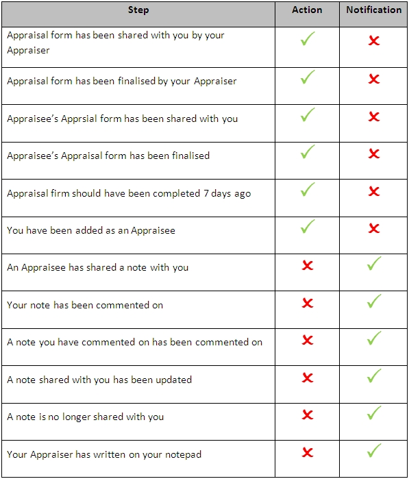 Alerts within the e-Appraisal system are divided into ‘Actions’ and ‘Notifications’. ‘Actions’ require the user to perform a task, Notifications are for information only. Both will be included on alert emails. Please see the chart below which details the associated alert for each process step: