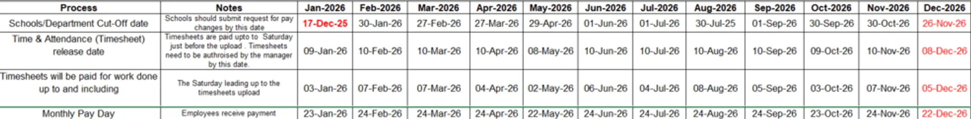 Please find below the relevant payroll cut-off dates for the calendar year. Information must be submitted to the HR Department by the dates shown. This is typically the 1st day of the calendar month (or the last working day of the month before) in which the salary or adjustment to the individual's salary is to be made. For example, salary payments/adjustments for August salary should be with HR by 1st August.