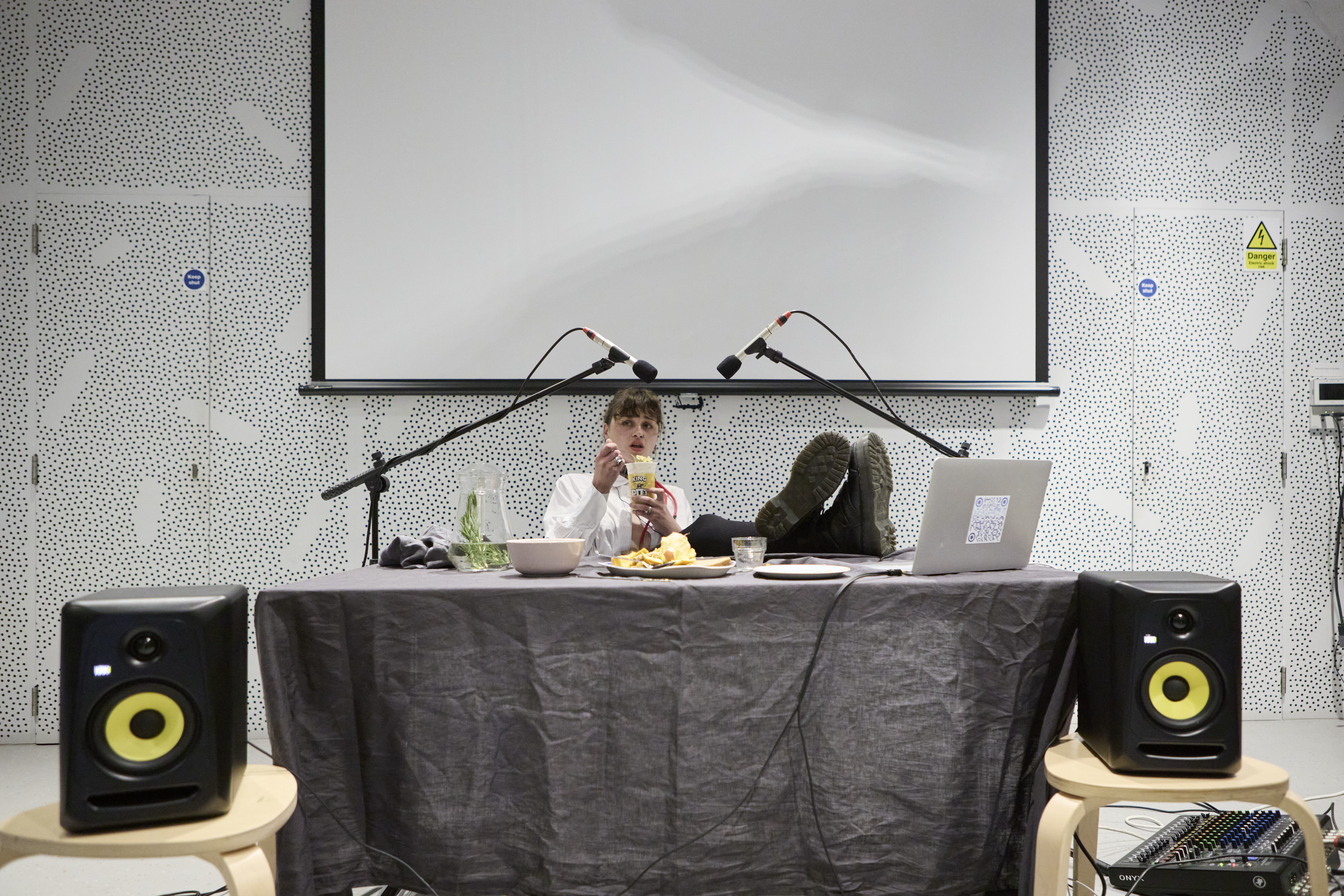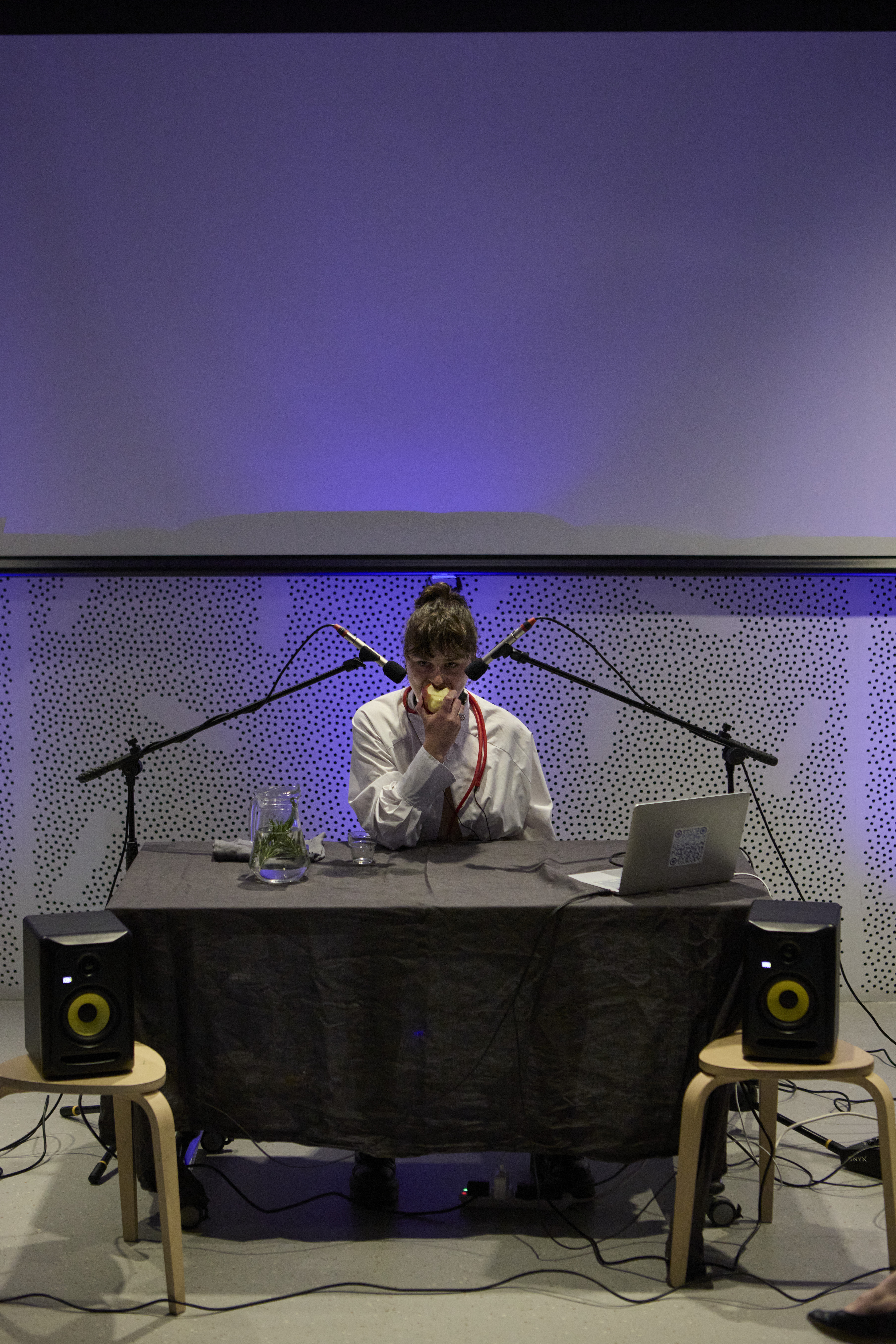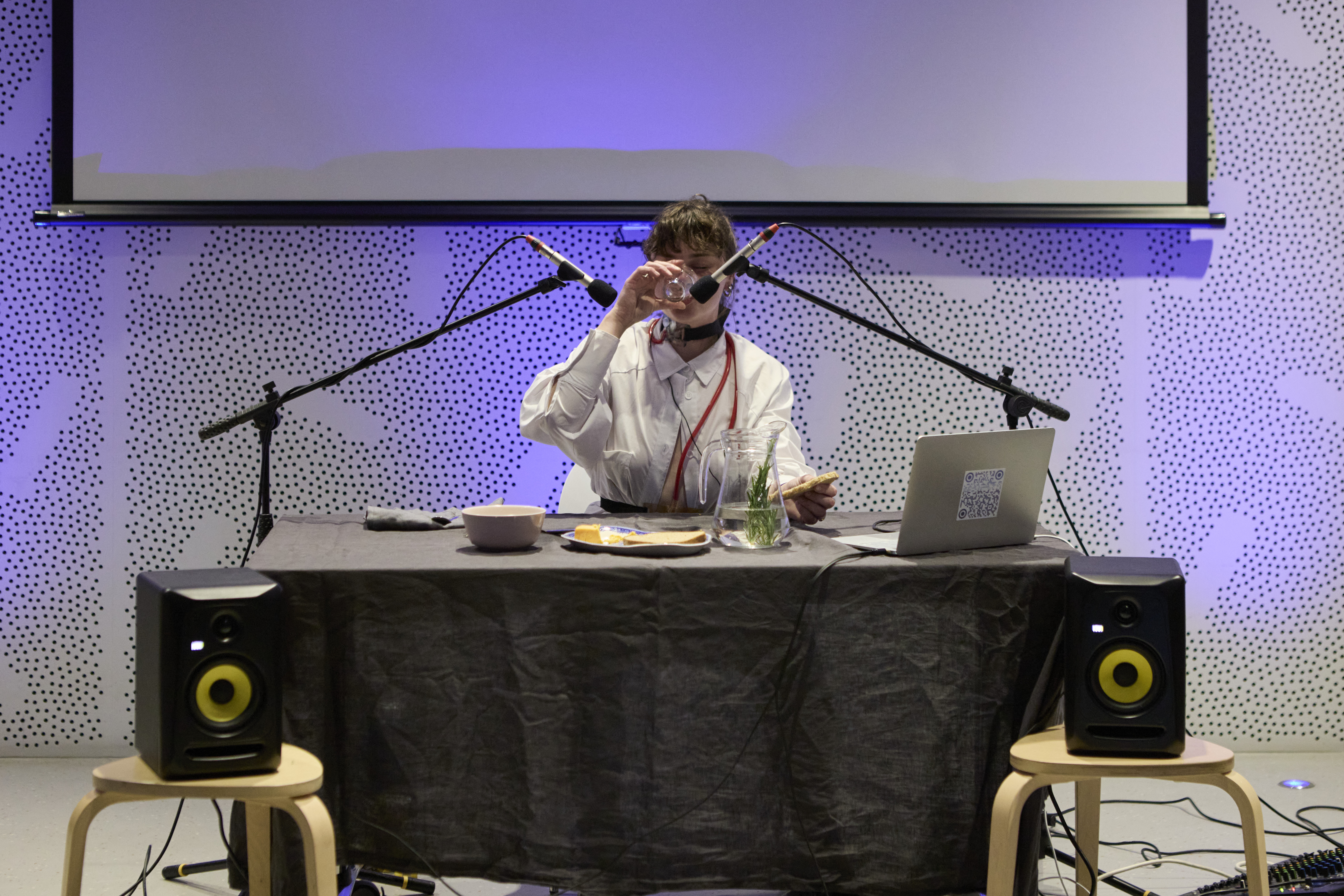 Sound artist Joanna Penso performed a solo version of her ‘Digestion Symphony’, where her own chewing and digestive sounds were amplified via contact microphones and synchronised to a metronome and ambient recordings of meal-time behaviour interspersed with moments of internal monologue. Calling this piece, her ‘rebellion’, Penso’s performance probed social discomfort at the abject aspects of eating and digestion (Images 6, 7, 9 and 10).