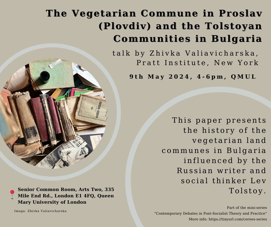 This paper presents the history of the vegetarian land communes in Bulgaria influenced by the Russian writer and social thinker Lev Tolstoy. Pledging to build a life ‘without the exploitation of one being by another,’ their members emphasized connection to land and the environment and practiced horizontal communalism, egalitarian spiritualism, and vegetarianism in conscious opposition to private property and the enclosures of land, against militarism and the use of violence, and against state power and the Church. There were over a dozen communes formed in Bulgaria during the first three decades of the twentieth century, and most of them lasted for only a few years. In this talk Zhivka will bring into focus the history of a vegetarian land commune founded in 1926 near Plovdiv, Bulgaria, which survived for over thirty years and served as a hub for vegetarian, Tolstoyan, anarchist, and alternative spiritual communities in the country.