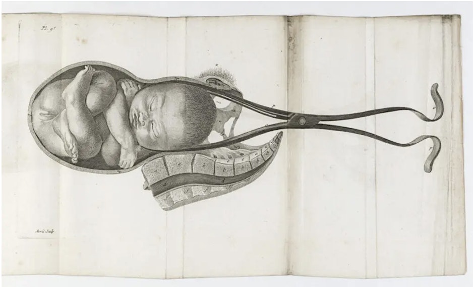 Image credit: Forceps assisted birth from L’art des accouchemens, 2nd volume, by Jean Louis Baudelocque Published, 1781. Plate XI. (Wellcome Images).