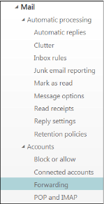 3. From the left navigation panel, under Mail > Accounts select Forwarding.
