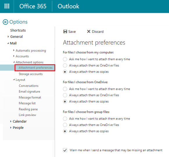 4. For the option “For files I choose from my computer:” make sure you select “Always attach them as copies”