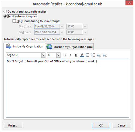 4. You can now set up your automatic reply (Out of Office) message or messages to suit your needs. Note: You have several options available to you. You can choose to send replies during a given time range. You can also customise the reply for those people ‘inside my organization’ (eg people with Queen Mary University email accounts) as well as “outside my organization” (eg everyone else).