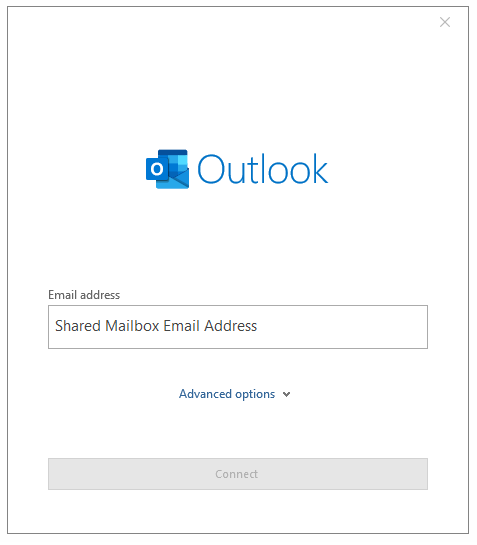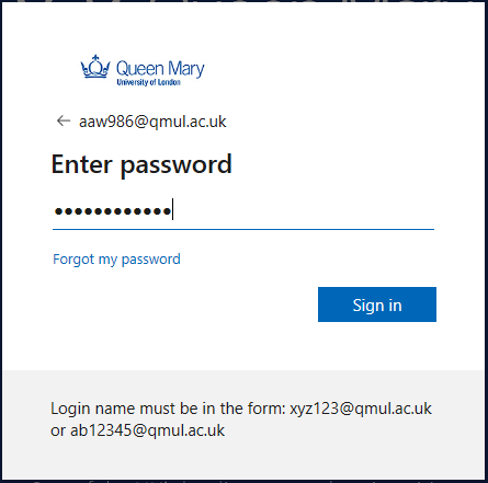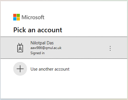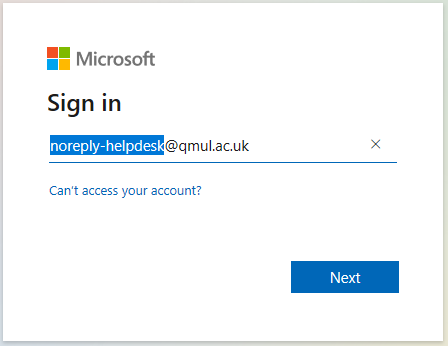 5. When the Microsoft Security window appears, enter your Queen Mary University username with '@qmul.ac.uk' appended, e.g. (abc123@qmul.ac.uk) for staff or (ab12345@qmul.ac.uk) for students, instead of Shared Mailbox address and Click Next.