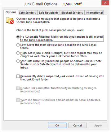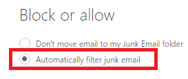4. Under the Block or allow heading, select the Automatically filter junk email option
