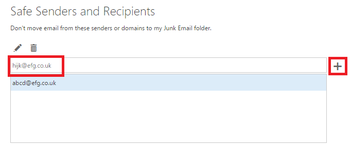 5. Under the Safe Senders and Recipients heading, type the email address, so that emails from the sender does not get moved to your Junk folder, and then select +