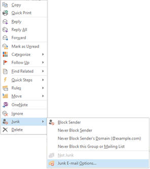 2. Right click on an email > Junk and then Junk E-mail Options…