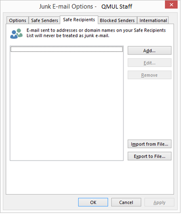 3. On the window that appears select the Safe Recipients tab. You do not need to alter the settings below