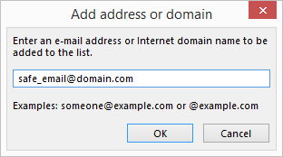 5. Enter the email address of the sender you wish to add as a safe sender and click OK