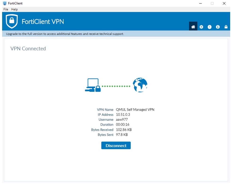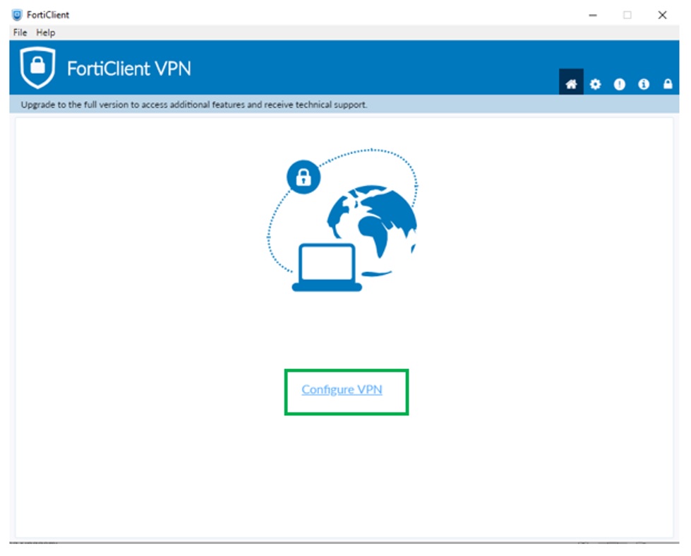 i) Double clicking on the FortiClient icon (in the task bar) will bring up the FortiClient window and you will be prompted to acknowledge that this software is the free version.