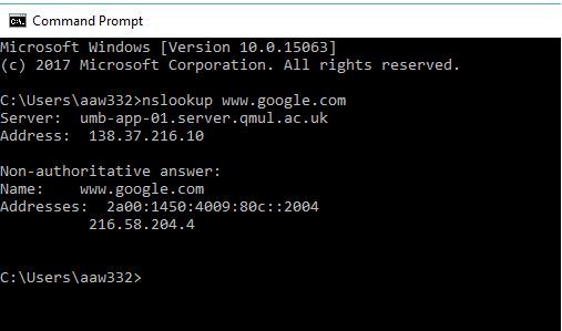 Once this has been done, you can test if this works using the DOS command prompt or terminal and typing ‘nslookup www.google.com’ or any other known domain to see if it resolves successfully using either 138.37.216.10 or 138.37.217.10.