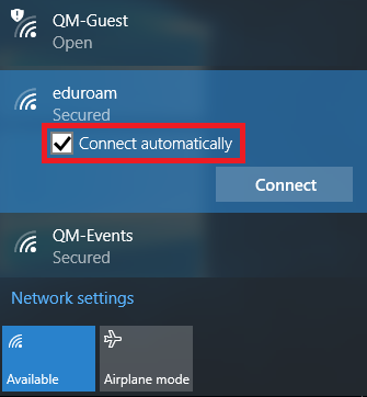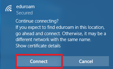 8. Click eduroam. Ensure that connect automatically is checked then click Connect