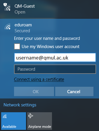 9. Enter username (in the format abc123@qmul.ac.uk for staff or ab12345@qmul.ac.uk for students) and password then click OK